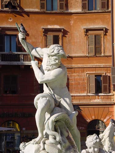 Piazza Navona : On the southern end is the Fontana del Moro, a fountain featuring a man astride a large fish. I mean, seriously astride that fish. You don't have to squint very hard for the bestiality angle. Tellingly, it's also called the Fontana dell' Acqua Felice – the Fountain of the Happy Water. On the northern end, there's another fountain of Poseidon (Fontana di Nettuno) battling a giant squid-like sea creature, whose tentacles are wrapped around his massive thighs. Poseidon is straddling the squid's head, and its eyes are looking up at his dangly bits with definite interest.
